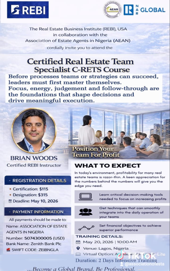 Join the Certified Real Estate Team Specialist (C-RETS) Course by REBI USA in collaboration with AEAN Nigeria.